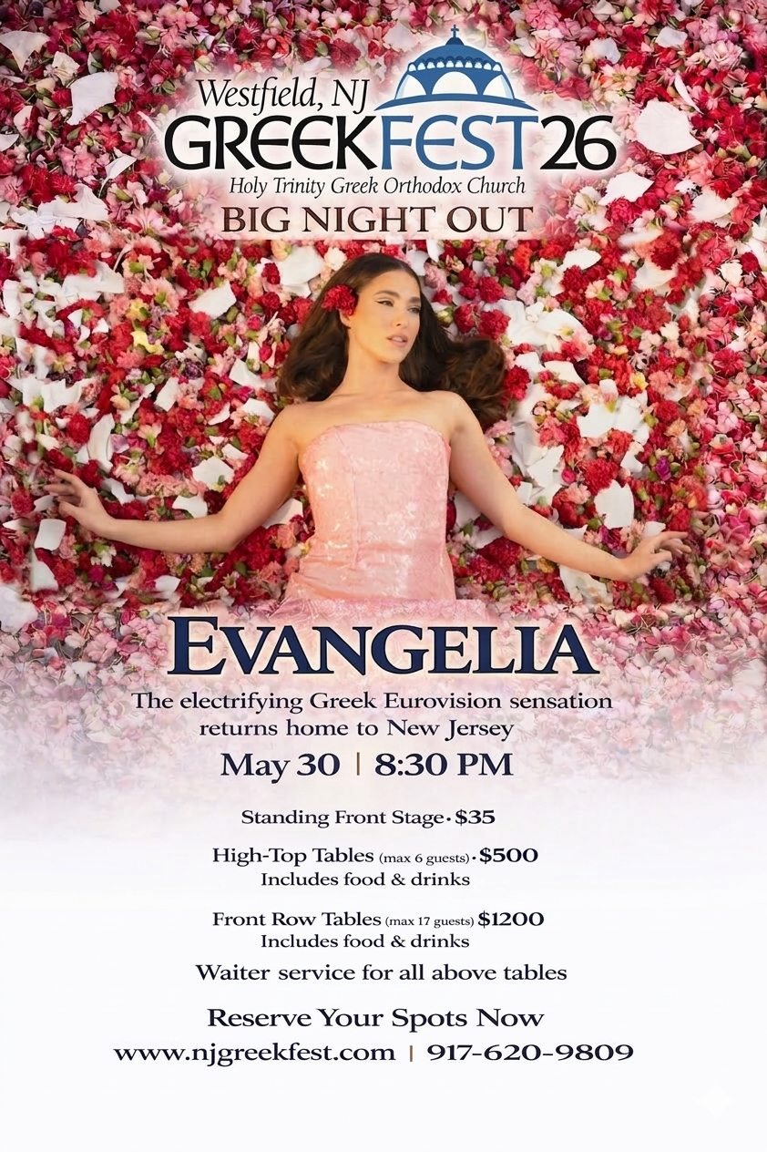This year, NJ GreekFest is thrilled to welcome the sensational Evangelia — the Greek-American pop star and Eurovision finalist, whose music blends modern pop with Greek sounds — returning to her New Jersey roots for an unforgettable live performance at our